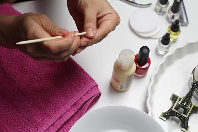Замочите руку снова, очистите ногти специальной щеточкой и тщательно высушите. Оберните вокруг указательного пальца уголок влажной льняной салфетки, осторожно отодвиньте лишнюю кутикулу и вычистите птеригий. Не обрезайте кутикулу! Используйте маникюрные щипчики только чтобы осторожно убрать рваные участки.
