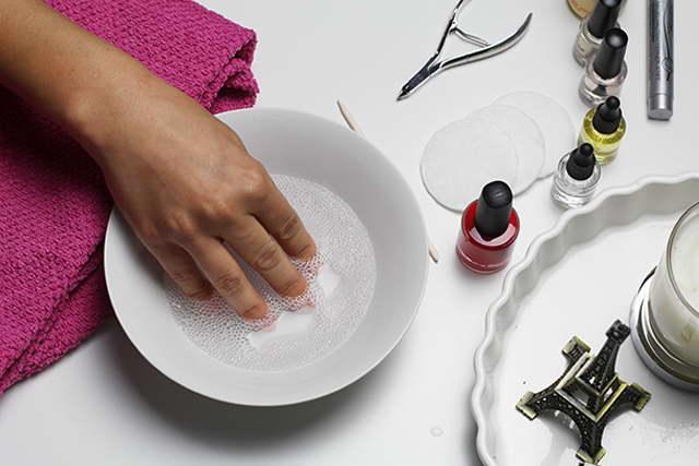 С помощью жидкости для снятия лака JESSICA, удалите весь лак ногтей. Добавьте Hand & Body Bath в теплую воду, замочите одну руку на несколько минут. Тщательно высушите её.